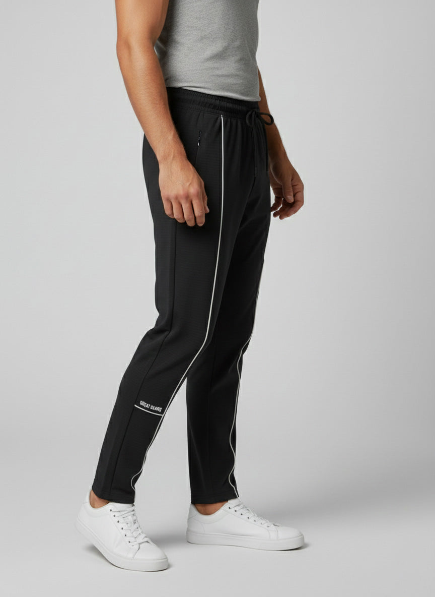 Designed for both training and everyday comfort, these men’s performance track pants combine a clean athletic look with functional design. Crafted from lightweight, breathable fabric, they offer smooth comfort and flexibility for workouts, running, or casual wear. The contrast piping detail adds a modern sporty touch, while the elastic waistband with adjustable drawstring ensures a secure, customized fit. With a tapered silhouette and zippered side pockets, these track pants deliver performance, style, and practicality in one versatile piece.