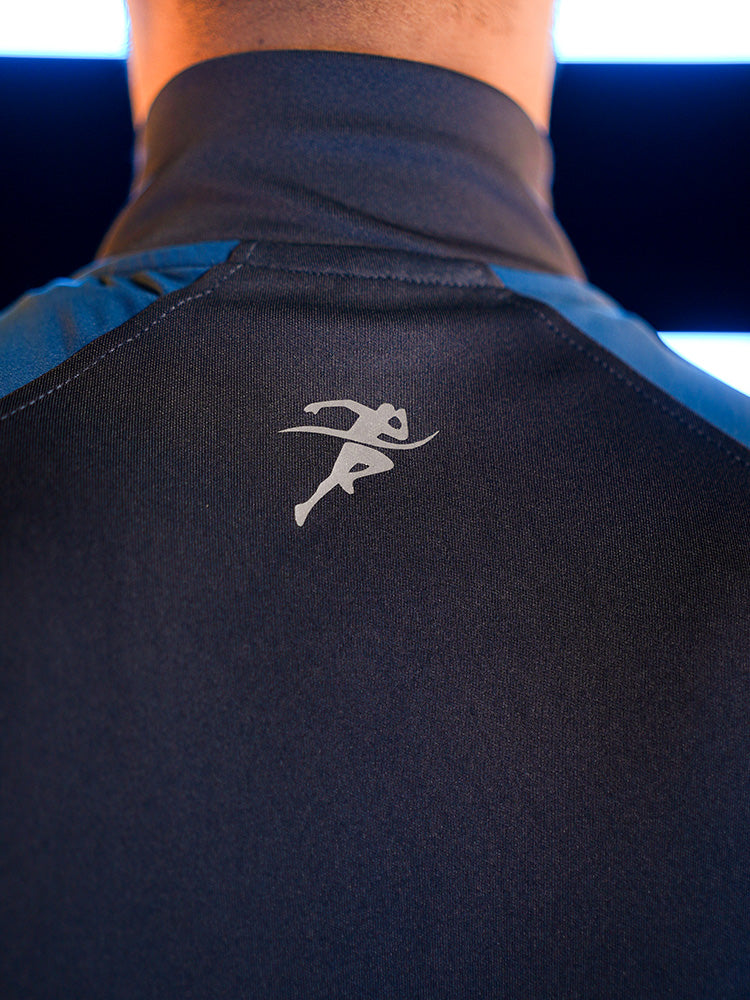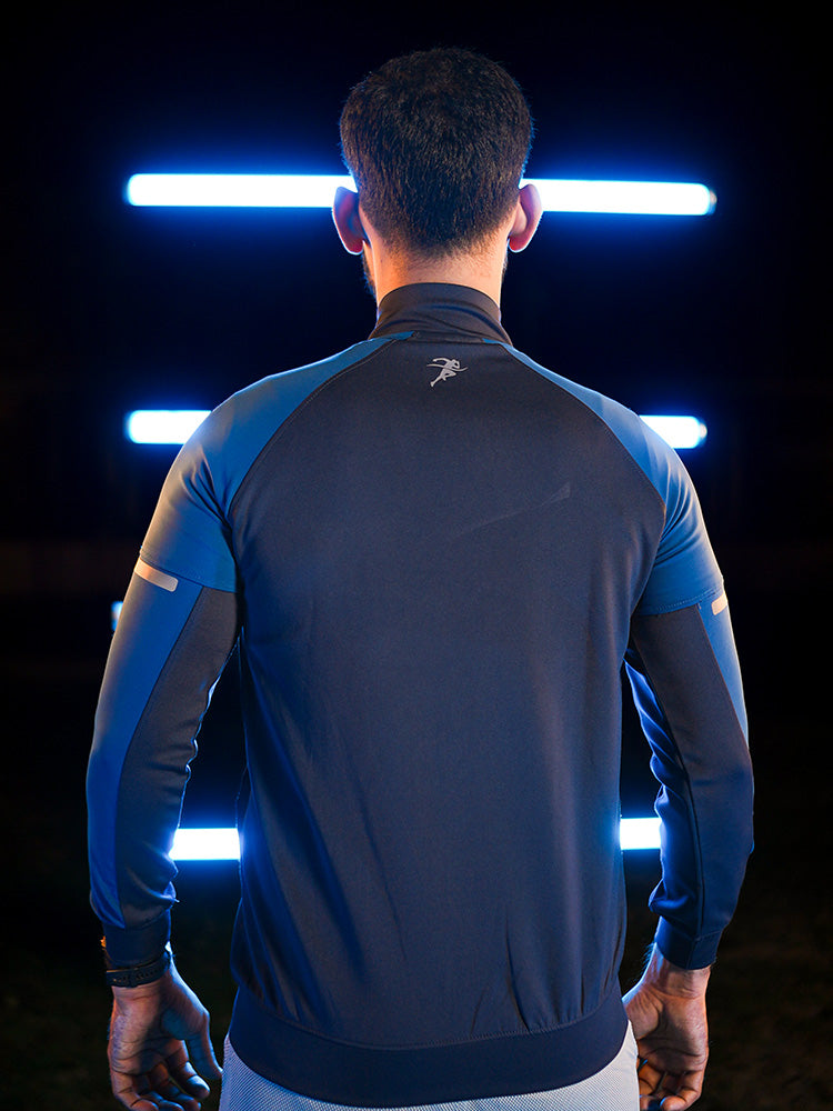 This jacket features a sleek two-tone design with a deep navy base and brighter blue panels on the shoulders and sleeves. The front showcases a clean Great Gears running-athlete logo in white, adding a sporty and energetic vibe. Reflective tape on the sleeves enhances visibility, giving it a professional athletic look perfect for night workouts.